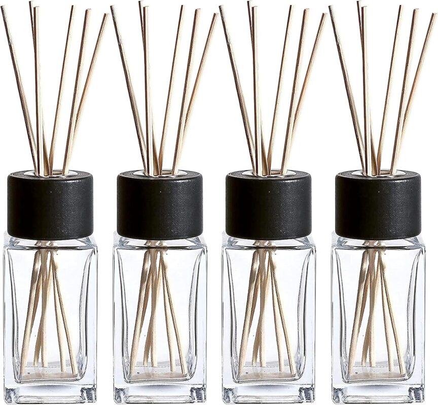 Natural Diffuser Reeds Bottles Sticks | Clear Glass Home Décor for Kitchen and Living Room | Black Wood Caps | Décorative Fragrance Set with Long Lasting Aroma - Set of 4